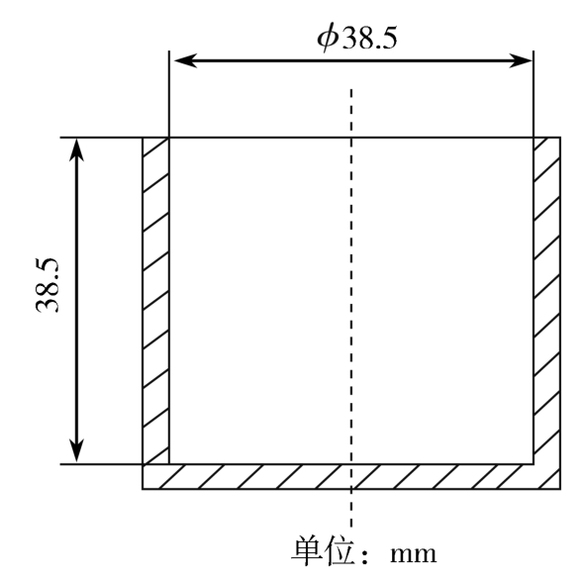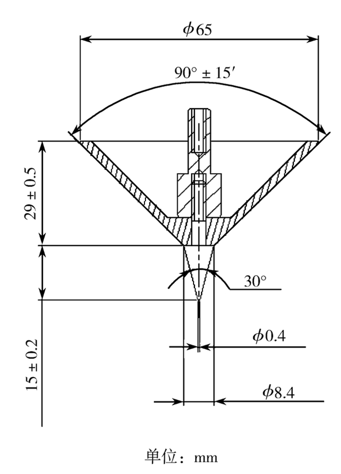 錐入度系指利用自由落體運(yùn)動(dòng),在25℃下,將一定質(zhì)量的錐體由錐入度儀向下釋放,測定錐體釋放后5秒內(nèi)刺入供試品的深度。儀器應(yīng)能自動(dòng)釋放錐體,即時(shí)測出錐體5秒所刺入深度;帶有水平調(diào)節(jié)裝置,保證錐桿垂直度;有中心定位裝置,用以使錐尖與樣品杯中心保持一致;帶有升降調(diào)節(jié)機(jī)構(gòu)能準(zhǔn)確調(diào)節(jié)錐尖,使錐尖與待測樣品表面恰好接觸。當(dāng)釋放錐體時(shí)錐桿與連接處應(yīng)無明顯摩擦,儀器測量范圍應(yīng)大于65mm。(1)試驗(yàn)工作臺(tái) 由水平底座、支柱、水平升降臺(tái)、釋放裝置、水平調(diào)節(jié)儀、錐入度值顯示裝置等組成。(2)錐體及錐桿 錐體由適當(dāng)材料制成的圓錐體和錐尖組成,表面光滑,共有三種錐體可供選擇:Ⅰ號(hào)錐體質(zhì)量為102.5g±0.05g,配套錐桿質(zhì)量為47.5g±0.05g;Ⅱ號(hào)錐體質(zhì)量為22.5g±0.025g,配套錐桿質(zhì)量為15g±0.025g;Ⅲ號(hào)錐體及錐桿總質(zhì)量為9.38g±0.025g。三種錐體形狀尺寸如圖1~圖3所示。圖3?、筇?hào)錐體及錐桿結(jié)構(gòu)(3)樣品杯 為平底圓筒,不同型號(hào)的錐體配套使用不同型號(hào)的樣品杯(圖4~圖6)。Ⅰ~Ⅲ號(hào)錐體配套使用的樣品杯的形狀尺寸如圖4~圖6所示。根據(jù)樣品量選擇適當(dāng)?shù)腻F體進(jìn)行測定,推薦選用Ⅱ號(hào)錐體進(jìn)行本項(xiàng)目的研究和測定。測定前,應(yīng)按照儀器說明書對儀器裝置進(jìn)行必要的調(diào)試,使錐尖恰好落于中心位置。除另有規(guī)定外,供試品按下述方法之一處理并在25℃±0.5℃放置24小時(shí)后測定。(1)將供試品小心裝滿樣品杯,并高出樣品杯上沿約2mm,避免產(chǎn)生氣泡,在平坦的臺(tái)面上震動(dòng)樣品杯約5分鐘,以除去可能混入的氣泡。(2)按照標(biāo)準(zhǔn)規(guī)定將供試品熔融后,小心裝滿樣品杯,并高出樣品杯上沿約2mm,避免產(chǎn)生氣泡。在25℃±0.5℃條件下測定。測定前刮平表面,將樣品杯置錐入度儀的底座上,調(diào)節(jié)位置使錐狀與供試品的表面剛好接觸。迅速釋放錐體(應(yīng)在0.1秒內(nèi)完成下落動(dòng)作)并等待5秒后,讀出錐入深度,以錐入度單位表示,1個(gè)錐入度單位等于0.1mm。為保證不同錐體測定結(jié)果的可比性,實(shí)際測定時(shí)應(yīng)將Ⅱ號(hào)錐體和Ⅲ號(hào)錐體的測定值依據(jù)公式換算成Ⅰ號(hào)錐體推測值。(1)使用Ⅰ號(hào)錐體測定 同法測定3次,結(jié)果以3次測定結(jié)果的平均值表示。如單次測定值與平均值的相對偏差大于3.0%,應(yīng)重復(fù)試驗(yàn),結(jié)果以6次測定結(jié)果的平均值表示,并計(jì)算相對標(biāo)準(zhǔn)偏差(RSD)。6次測定結(jié)果的相對標(biāo)準(zhǔn)偏差應(yīng)小于5.0%。(2)使用Ⅱ號(hào)錐體測定 同法測定3次,依據(jù)下述公式將測定值換算成使用Ⅰ號(hào)錐體的推測值。結(jié)果以3次推測值的平均值表示。如單次推測值與平均值的相對偏差大于3.0%,應(yīng)重復(fù)試驗(yàn),結(jié)果以6次推測值的平均值表示,并計(jì)算相對標(biāo)準(zhǔn)偏差(RSD)。6次推測值的相對標(biāo)準(zhǔn)偏差應(yīng)小于5.0%。對各論中規(guī)定采用Ⅰ號(hào)錐體測定錐入度的品種,可采用Ⅱ號(hào)錐體測定后,按上述公式將測定值換算成Ⅰ號(hào)錐體的推測值。如經(jīng)換算得到的推測值超出標(biāo)準(zhǔn)規(guī)定限度,則應(yīng)采用Ⅰ號(hào)錐體再次測定,并依據(jù)其實(shí)際測定值判斷樣品是否符合規(guī)定。(3)使用Ⅲ號(hào)錐體測定 同法測定3次,依據(jù)下述公式將測定值換算成使用Ⅰ號(hào)錐體的推測值。結(jié)果以3次推測值的平均值表示。如單次推測值與平均值的相對偏差大于5.0%,應(yīng)重復(fù)試驗(yàn),結(jié)果以6次推測值的平均值表示,并計(jì)算相對標(biāo)準(zhǔn)偏差(RSD)。6次推測值的相對標(biāo)準(zhǔn)偏差應(yīng)小于10.0%。